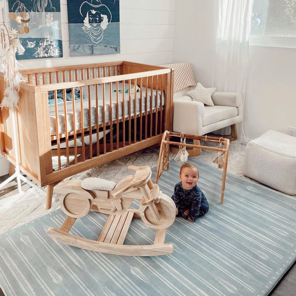 Our Bowie Playmat was crafted with dusty blue tones and is inspired by handwoven cotton rugs from Banskho, India. With a soft and broken-in-feel, these natural blue and indigo hues easily compliment any room. It's one of our personal favorites, and with a quick flip over, your little ones can explore a subtle fantasy-world without over-stimulating their senses. Let their imaginations run wild.